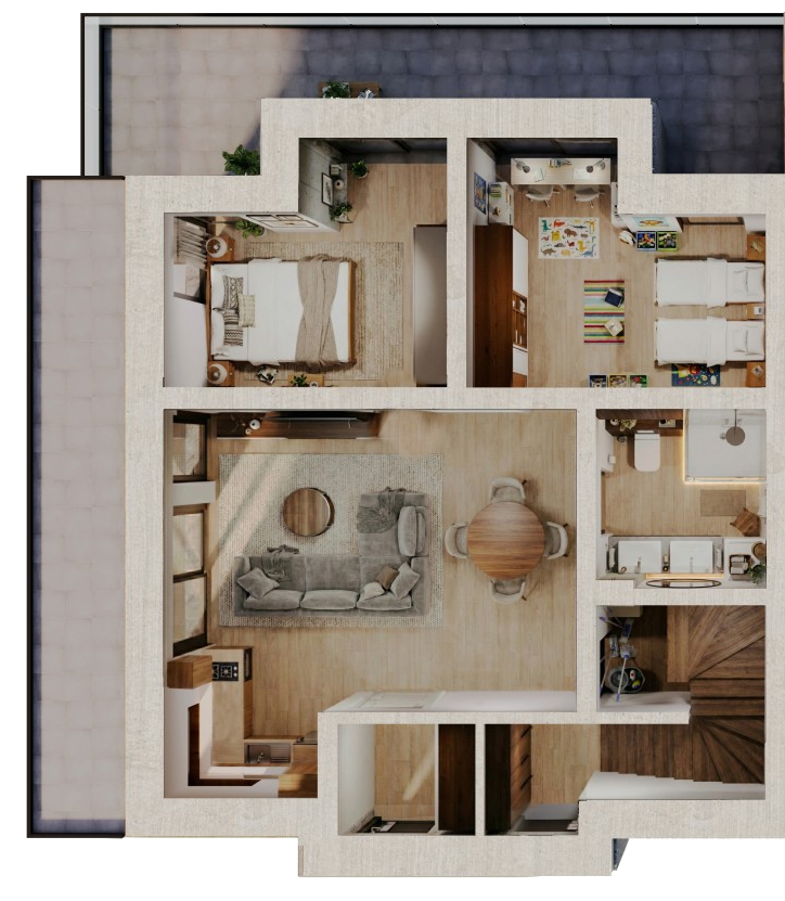 Prywatna strefa relaksu i rozrywki Poziom rekreacyjny zaprojektowany jako niezależna przestrzeń, oddzielona od części mieszkalnej, zapewniająca pełną swobodę użytkowania.