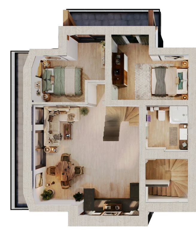 Dodatkowy pokój i łazienka Układ antresoli przewiduje dodatkowy pokój oraz łazienkę, co zwiększa funkcjonalność apartamentu i komfort codziennego użytkowania.