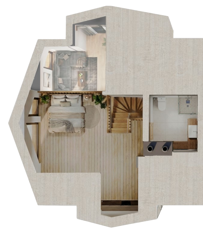 Prywatna strefa nocna Antresola pełni funkcję wydzielonej, spokojnej przestrzeni przeznaczonej do wypoczynku i regeneracji, naturalnie oddzielonej od strefy dziennej apartamentu.
