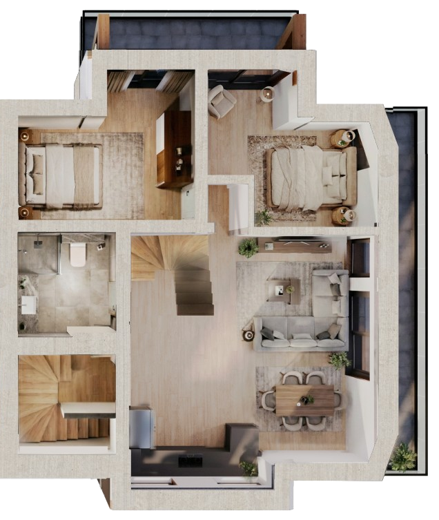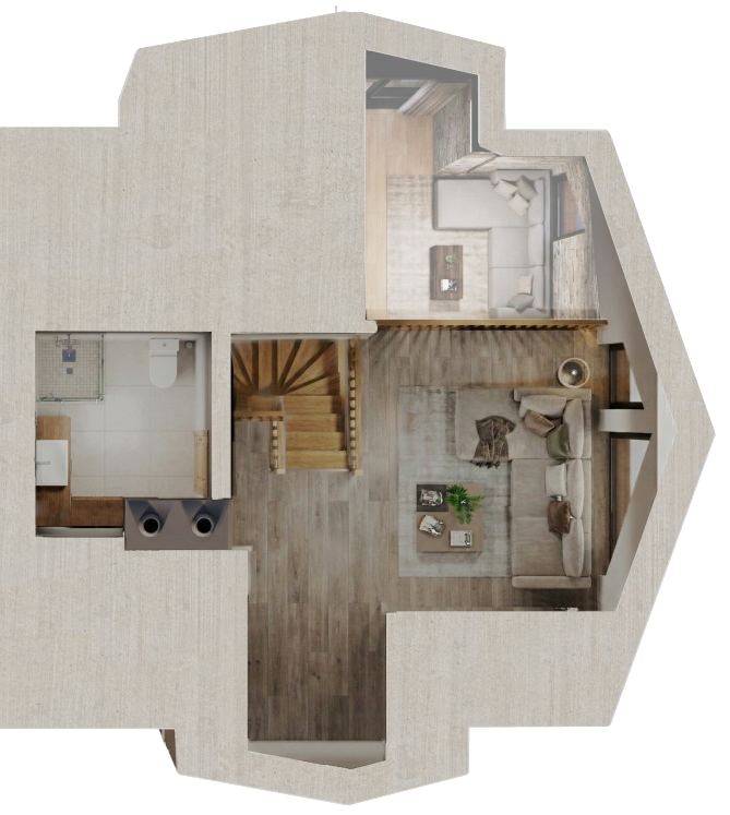 Dodatkowy pokój i łazienka Układ antresoli przewiduje dodatkowy pokój oraz łazienkę, co zwiększa funkcjonalność apartamentu i komfort codziennego użytkowania.